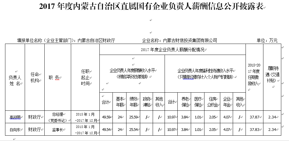 2017年度內(nèi)蒙古自治區(qū)直屬國有企業(yè)負責(zé)人薪酬信息公開披露表