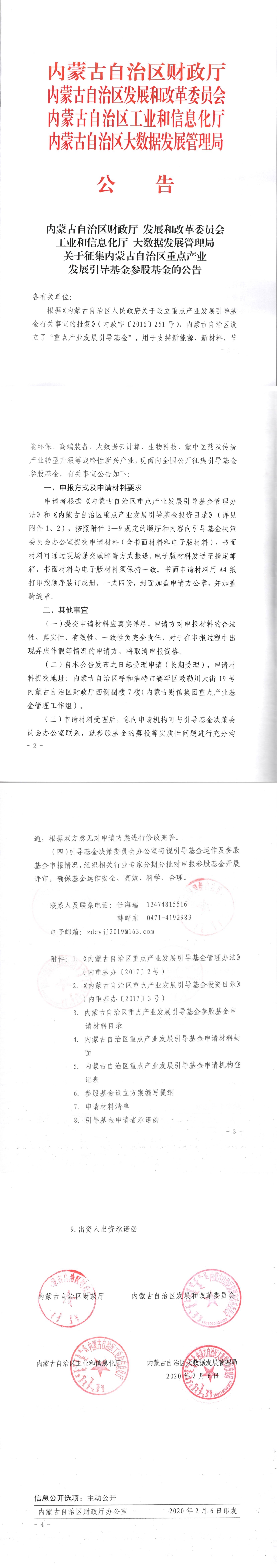 內蒙古自治區(qū)財政廳 發(fā)展和改革委員會 經濟和信息化廳 大數據發(fā)展管理局 關于征集內蒙古自治區(qū)重點產業(yè)發(fā)展引導基金參股基金的公告