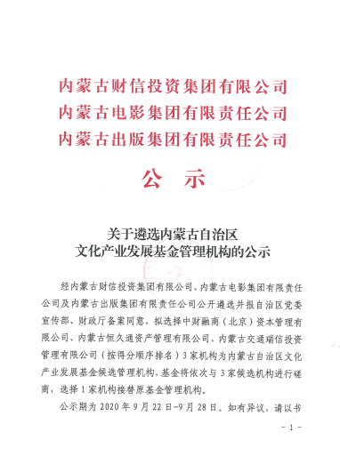 關于遴選內(nèi)蒙古文化產(chǎn)業(yè)發(fā)展基金管理機構(普通合伙人/執(zhí)行事務合伙人)的公告